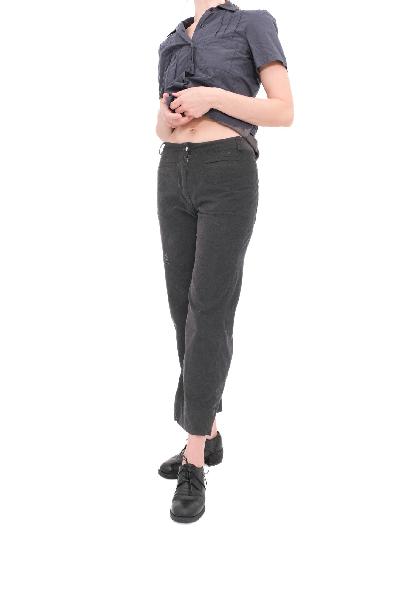 Thin Wale Cotton Corduroy fitted trousers, starts a little below the belly button, fitted in the hips and bum with a looser slightly flared leg. A great casual , year round, everyday pant.