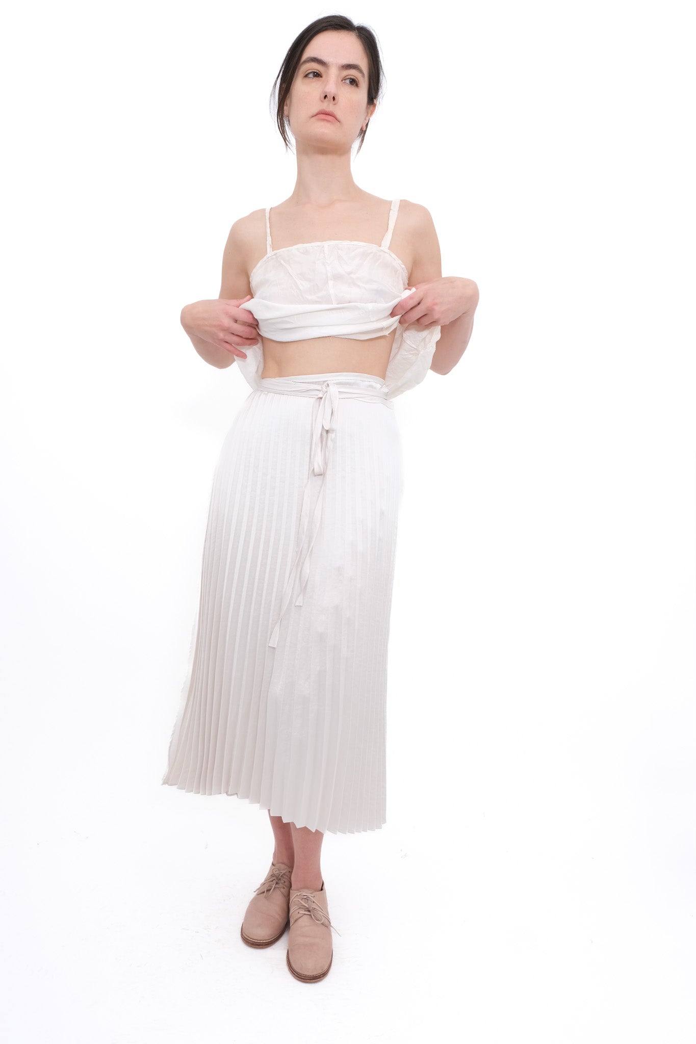 Polyester is the only way to make pleats permanent ( they are "melted" in with steam), so we have sourced the most beautiful polyester from Japan. This ankle grazing skirt that is a simple wrap style with an extra long tie to really punctuate the wrapping bit.